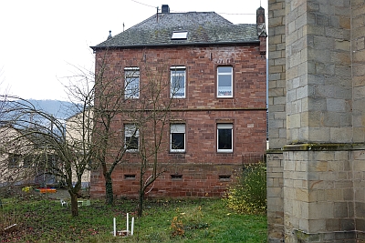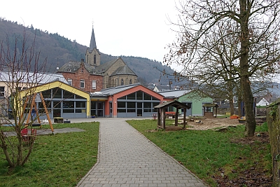 Das Kirchengebiet reichte bis an die Kyll. Für den Bahnbau erwarb der Staat das beanspruchte Gelände 1870 käuflich von der Kirche. Die Pfarrkirche wurde 1865 bis 1870 erbaut. Das Pfarrhaus kurz nach 1890. [1]