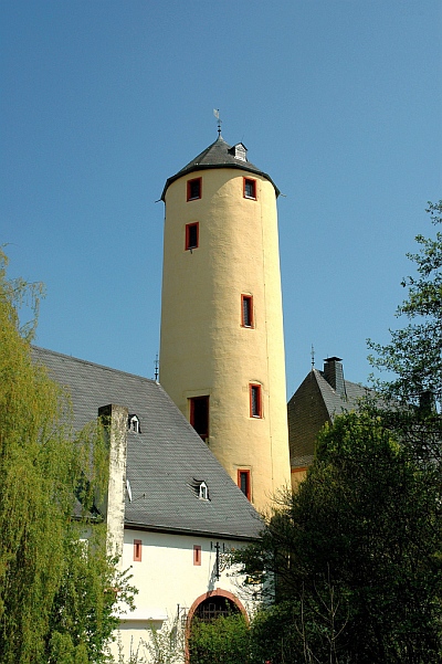 Wasserburg. Die Burg wurde 1263 als Besitz der AbteiSankt Maximin genannt, um 1290 erbaute man den noch heute das Bild bestimmenden 26 Meter hohen, runden Bergfried. Erbaut zum Schutz der Straße Trier-Bitburg-Prüm-Köln über die Nims.