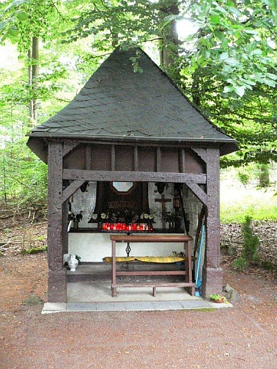 Da, wo die Pilgerstraße von Udler kommend an den Sandgruben die Kreissteraße überquert, stehen unweit im Buchenwald am Holzmaar zwei Wahrzeichen, die auf die Bedeutung des Pilgerweges hinweisen: das 150jährige Missionskreuz und das Pilgerkreuz! Ersteres hat seinen Platz im "Steipenheiligenhäuschen"; so nennt der Volksmund den kapellenartigen Bildstock am Waldeingang seiner Bauweise wegen. Mit "Steipen" sind die großen Holzpfosten gemeint, die den Rahmen des kleinen Bauwerks abgeben. Hier sollen vor langer Zeit einmal Volksmissionen unter freiem Himmel stattgefunden haben, die auch in späterer Zeit hin und wieder in kleinerem Rahmen wiederholt wurden. Das Missionskreuz soll die Erinnerung an diese Missionen wachhalten. Unter anderem ist auch beim Volke in Erinnerung, daß um das Jahr 1830 der damalige preußische Kronprinz mit einem Kürassierregiment anläßlich größerer Manöver auf einem historischem Gelände mit Mann und Roß Biwack bezog. Damals vielleicht nur im Schiffelverfahren ab und zu in bäuerlicher Nutzung liegen – die übrigen Jahre mit Ginster bewachsen -, ist das ganze Gelände heute seit langem anhaltend unter dem Pflug.