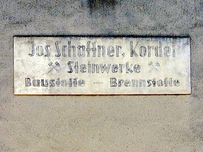 [...] Um so mehr war Josef Schaffner bestrebt, seinen Betrieb wieder leistungsfähig aufzubauen. Seinen Steinbruch hatte Schaffner schon Jahre vor dem Krieg auf den Steinkopf verlegt. Erwähnenswerte Bauten, für die Schaffner schon vor dem Krieg die Bausteine und das Hauwerk geliefert hat, sind unter anderem: die Pfaffendorfer Kirche, die Sankt-Josef Kirche in Köln, das Kloster Clerf in Luxemburg und anderes mehr. Noch vor dem zweiten Weltkrieg hatte Schaffner 75 Leute un Kordel einschließlich in nahen Dörfern kyllaufwärts beschäftigt. Interessanterweise ist ein Zeugnis des Kölner Dombaumeisters aus dem Frühjahr 1914 erhalten, in welchem der Firma Josef Schaffner die Güte der Kordeler Sandsteine rühmlich bewertet wird. [1]