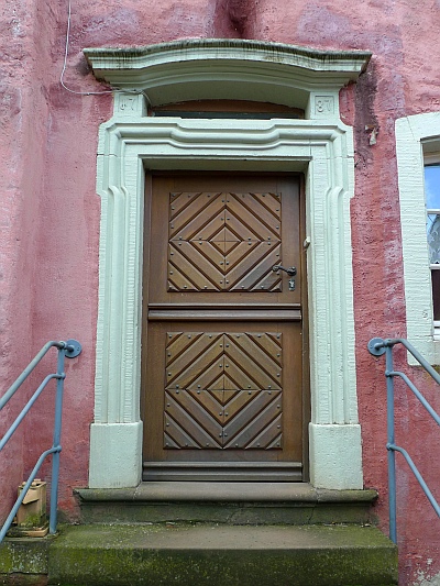 Die Haustür in der linken Achse wird von einer kräftig profilierten, geohrten Werksteineinfassung gerahmt, auf der ein niedriges, segmentbogig verdachtes Oberlicht sitzt, hier stehen beiderseits die Ziffern des Baujahres. In der Fassadenmitte befindet sich ein mit Pultdach abgedeckter Backofenvorbau. In der rechten Traufseite sind drei Fensterachsen, die linke in ganzer Höhe durch einen Anbau des 19. Jahrhunderts verdeckt, über den das Hauptdach abgeschleppt ist. Die rückwärtige Giebelseite wurde nach Beschädigung im Zweiten Weltkrieg neu aufgemauert; nur das in strebenlosem Fachwerk konstruierte Giebeldreieck stammt vermutlich noch vom ersten Bauzustand. Im Inneren ist vor allem die originale Flurküche mit dem später verschlossenen Rauchfang des Herdfeuers und einem Heiztürchen für den Stubenofen in der Feuerwand bemerkenswert,- der heutige Hausflur wurde erst in neuerer Zeit von dem Raum abgetrennt.