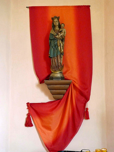 Der Innenraum ist schlicht gehalten mit einer abgerundeten Decke und einem barocken Altarretable.