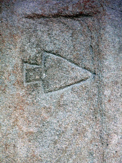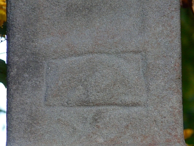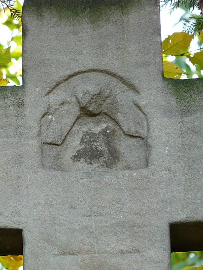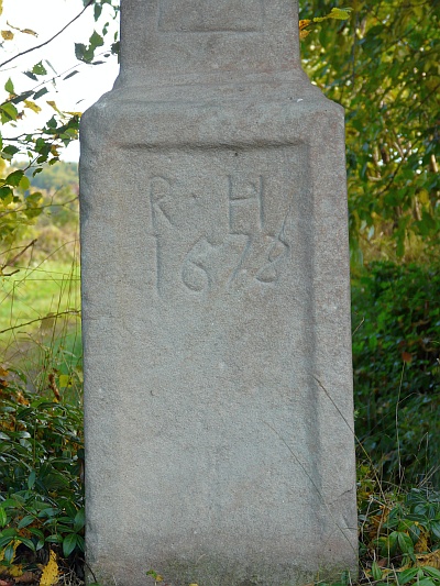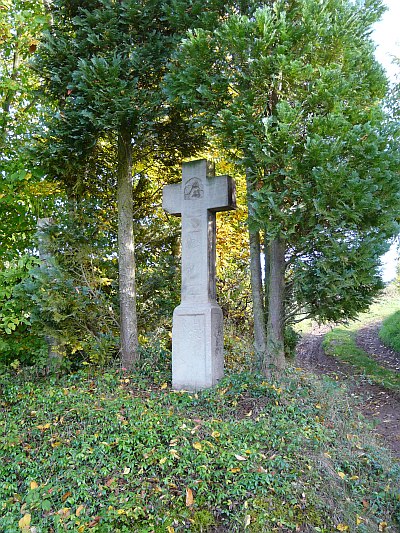 Hohes, aus dem Schaft mit Kreuzfuß wachsendes Balkenkreuz mit Nische zwischen den Kreuzbalken. den Schaft schmücken seitlich Kanneluren und eine geometrische Spiegelvertiefung mit dem Relief einer Pflugschar. Das 1678 datierte Kreuz ist laut der Inschrift RIP ein Totengedächtnis. [1]