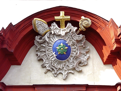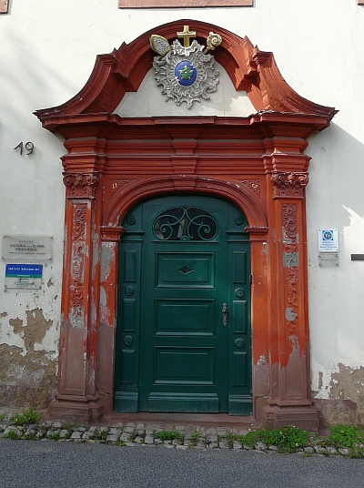 Reiches Sandsteinportal mit Pilastern, geschweiftem Giebel und Wappen. Foto um 1900. [2]