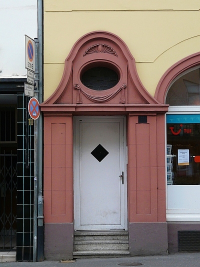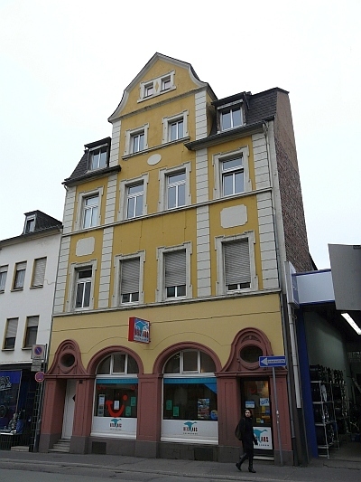 Dreigeschossiges späthistoristisches Wohn- und Geschäftshaus, sandsteingegliederter Ziegelbau mit Mansarddach. [1]