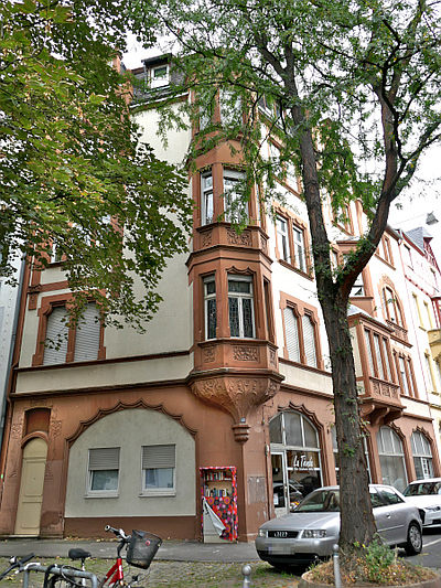 Viergeschossiges Eckwohn- und Geschäftshaus mit dreigeschossigem Polygonalerker, Mischformen aus Neugotik und Jugendstil, 1904; markante städtebauliche Situation. [1]
