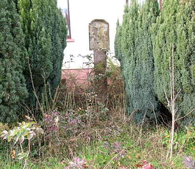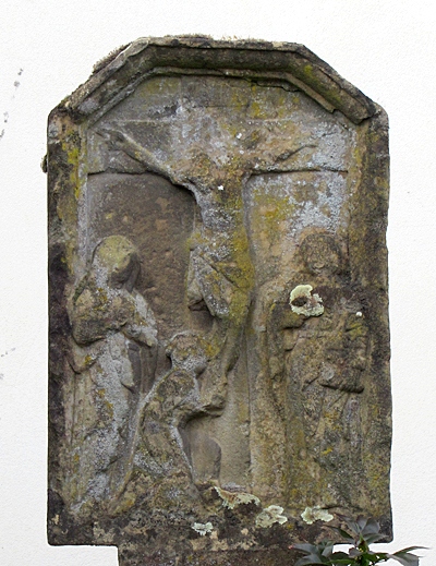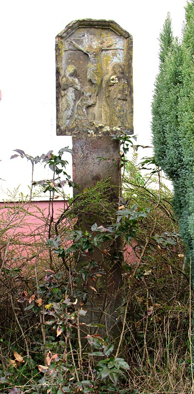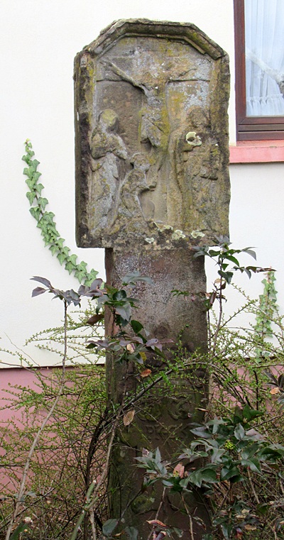 Wohl aus zwei verschiedenen Kreuzen zusammengesetztes Schaftkreuz, am Schaft Rollwerkkartusche, im Bildfeld Kreuzigungsrelief, wohl aus dem 17. Jahrhundert. [1]