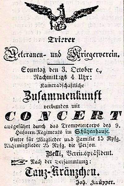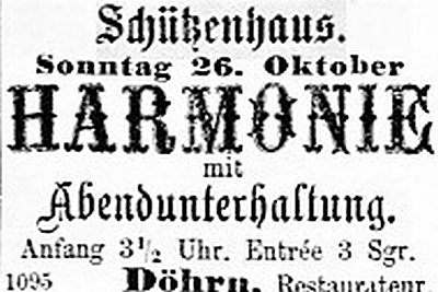 Leider ist über den Schießbetrieb nichts bekannt, wohl aber über die gesellschaftliche, gastronomische Nutzung des Hauses. In den Jahren 1873-1875 erschienen in verschiedenen Trierer Zeitungen zahlreiche Anzeigen über Veranstaltungen im Schützenhaus. In der "Mosel-Zeitung" waren es im Zeitraum vom 5.10.1873 - 4.1.1874 zehn Anzeigen des "Restaurateur" Döhrn, wohl der Pächter des Schützenhauses, der zur "HARMONIE mit Abendunterhaltung" einlud. [Bild 4] der Zeitung "Trier´sche Stadt-Klatsch" vom 3.10.1875 lud der "Trierer Veteranen- und Kriegerverein", zu einer kameradschaftlichen Zusammenkunft mit "Concert ausgeführt durch das Trompetencorps des 9. Husaren Regiments und anschließendem Tanz-Kränzchen" ein. Auch der Sänger-Chor des Kriegervereins traf sich dort, wie aus einer Anzeige in der selben Zeitung vom 11.1. 1874 über die Absage einer Zusammenkunft, hervorgeht.
