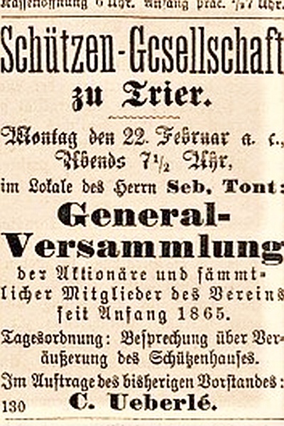 Erbauer des Schützenhauses im Jahre 1866 war vermutlich die 1865 gegründete "Schützen Gesellschaft zu Trier". Diese "Gesellschaft" rief 1875, also 9 Jahre nach der mutmaßlichen Erbauung des Schützenhauses, in der "Neue Mosel-Zeitung" Nr. 41 zu einer Generalversammlung ein. Tagesordnung: ist die Besprechung über Veräußerung des Schützenhauses. [Bild 3]