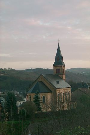 Die 1864 in erhöhter Lage erbaute Kirche 1891 von Bauunternehmer Steinmetz aus Wasserliesch erweitert und erhielt 1893 den Turm.