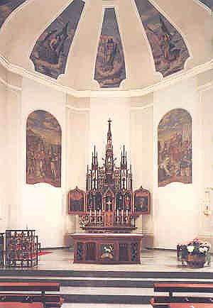Nach Südosten ausgerichteter in fünf Seiten eines Achtecks geschlossener Saalbau. Der 1839-1841 von Kommunalbaumeister Johann Baptist Bingler errichtete Kirchbau entstand gegenüber seiner Vorgängerkirche (heute Parkplatz).
