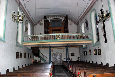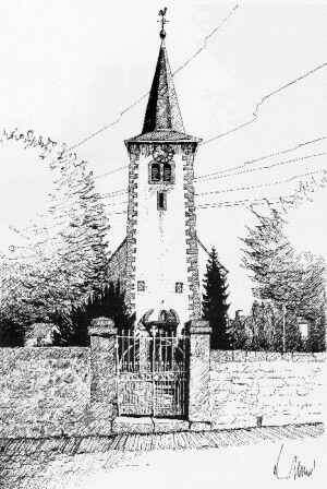 Saalbau, bezeichnet 1606, um Querhaus und Chor erweitert, mittelalterlicher Westturm. [1]