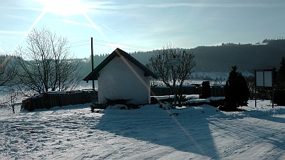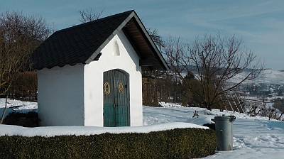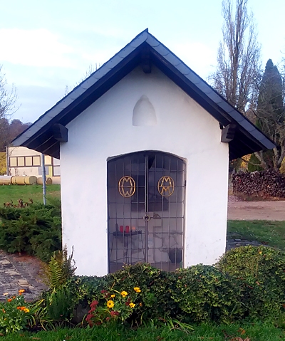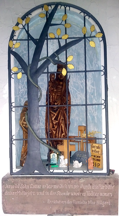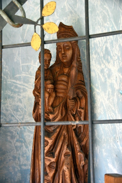 Desweiteren in Kapellennische Muttergottes-mit-Kind-Holzfigur und diverse Devotionalien.