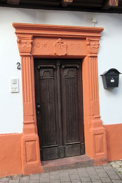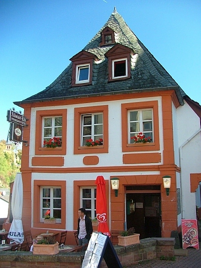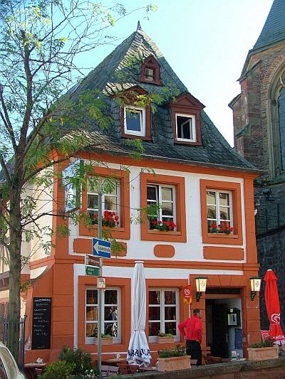 [...] Dem 1659 bezeichneten, im Erdgeschoß massiven, im Obergeschoß aus Fachwerk bestehenden barocken Anwesen wurde an der marktseitigen Giebelfront 1809 ein zwei Meter tiefer, an der Torgasse einspringender, klassizistischer Anbau angefügt und unter die Abwalmung des hohen Giebeldaches gebracht. In der Tradition der späten Renaissanceportale in Saarburg steht das korinthische Pilasterportal mit dem die Kapitelle verbindenden Sturz. Darauf zwischen der Datierung ein Wappenschild mit Brezel als Berufszeichen und den Initialen AE (Anton Emmerich) und JK (Johanna Koch). Im mittleren Brüstungsschild der dreiachsigen Front die Bauinschrift MH 1809 ELM (Matthias Hentgen, Elisabeth Macher). Im Innern die steinerne Wendeltreppe erhalten. Als städtebauliche Dominante hat das Anwesen das Platz- und Stadtbild mitprägende Bedeutung. Das Anwesen dokumentiert als reichster Fachwerkbau der Stadt auch diese im 17. Jahrhunderts noch verbreitete Bauweise. [1]