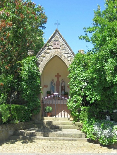 1923 wurde die kleine, dreiseitig schließende Kapelle aus gelben Sandsteinquadern errichtet. Sockel und Kanten werden von Bossenquadern betont, ein Traufgesims vermittelt zum Schieferdach. Ein hoher, spitzer Bogen füllt fast die gesamte Vorderfront aus. Am Fuß des Giebels befinden sich Steinvasen. Anlaß zur Errichtung war die Versetzung eines Wegekreuzes von 1619 hierher, das beim Ausbau der damaligen Provinzialstraße seinen angestammten Platz verlor. Das Schaftkreuz mit einem Corpus zeigt ein Relief des heiligen Hubertus. [2]