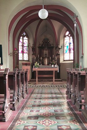Spätgotischer Chor aus dem 15. Jahrhundert, Dreiachsiges Schiff, 1788 errichtet. Im Chor aus der Erbauungszeit stammendes Sakramentshäuschen mit Stabrahmung. In den Scheitelsteinen Figurendarstellungen von Petrus, Christus mit dem Lamm sowie Steinmetzzeichen. Spätgotisches Kruzifix und Vesperbild. Ansonstens größtenteils barocke Ausstattung.