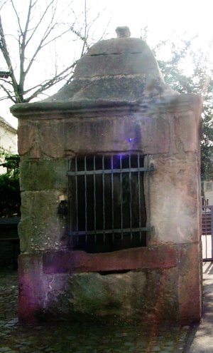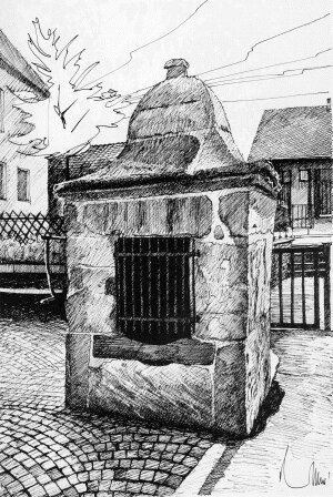 Aus Sandsteinquadern gemauertes und mit Steinhaube abgeschlossenes Brunnenhaus, wohl 18. Jahrhundert. Die rechteckige Öffnung zum Brunnenschacht mit Seilwinde vergittert. Das zum Maximiner Hofgut gehörende Brunnenhäuschen ist seltenes Relikt dörflichen Lebens. [1]