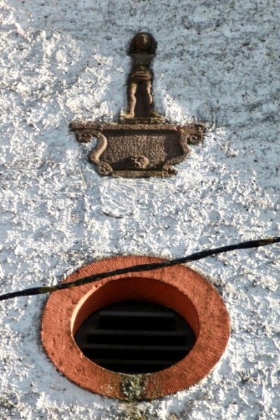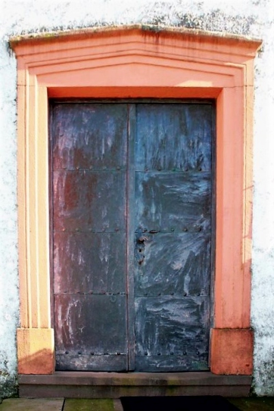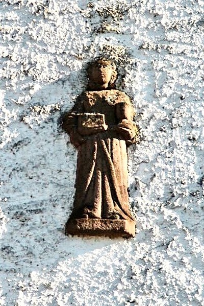 Die Kirche, vor der wir stehen, wurde in den Jahren 1847 bis 1849 erbaut. Oberhalb der Eingangstüre sind zwei ältere Steinfiguren eingemauert. Die obere stellt den heiligen Sebastian dar. Die andere Figur scheint die heilige Odilia, eine Äbtissin aus dem Elsass, zu sein, worauf das Buch und der Kelch, welche die Figur in den Händen hält hindeuten.