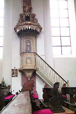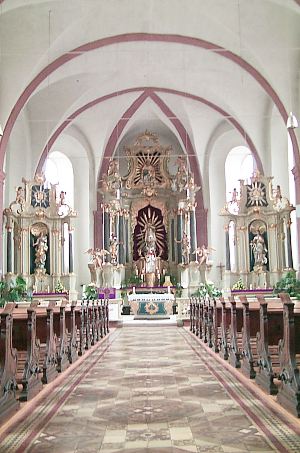 1771 wohl nach Plänen von Johannes Seiz erbaut. Reiche einheitliche Ausstattung der Erbauungszeit. Bildnisgrabstein für Gerhard Platt von Longuich (†1496). Friedhofstor mit schmiedeeisernem Gitter um 1770. [1]