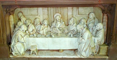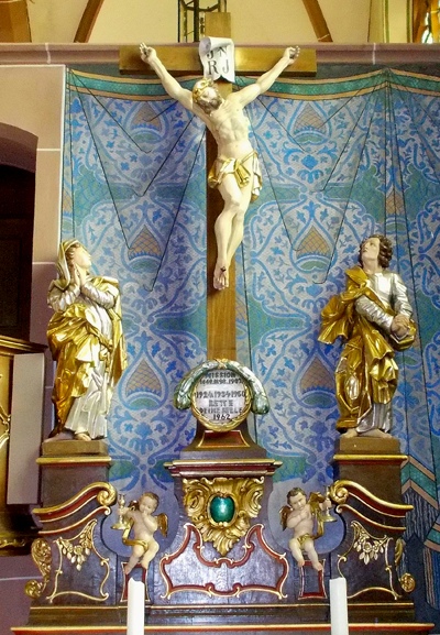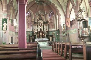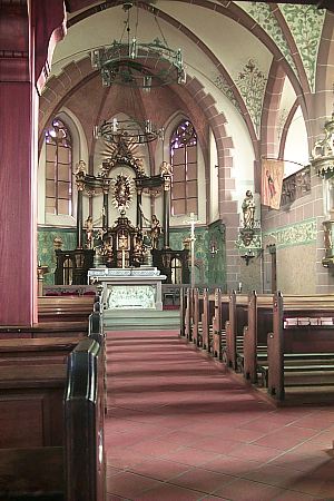 1910 vom Diözesanbaumeister Heinrich Renard als dreischiffige Halle in neugotischen Formen erbaut. Neben dem Außenportal Figur des heiligen Johannes des Täufers aus dem 14. Jahrhundert. [1]