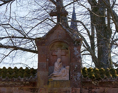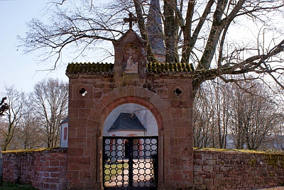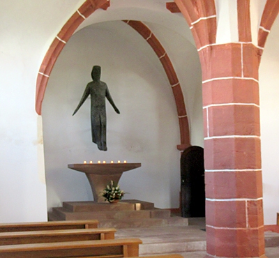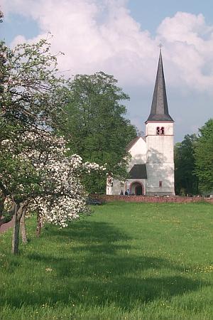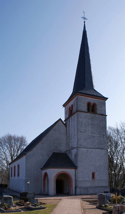 Ehemalige Pfarrkirche Sankt der Täufer, jetzt Gedenkstätte für die Gefallenen des 2. Weltkriegs (alte Kirche). Am östlichen Rand des Hochplateaus, etwa 800 Meter vom Dorfkern alleine inmitten des ummauerten Kirchhofs stehende Pfarrkirche, die 1442 zur Filialkirche absank. Über römischen Mauerzügen und einem fränkischen Friedhof des 7ahrhunderts erbaut. Zweischiffige Hallenkirche mit ausser der Achse stehndem romanischen Westturm aus dem 12. Jahrhundert. Besonderer Schmuck sind Fratzen auf den Kämpfersteinen und eine groteske Figur auf der Schallarkade. Das Innere präsentiert sich in der nachträglichen, 1629 vollendenten spätgotischen Einwölbung durch den Baumeister Nikolaus aus Perl.