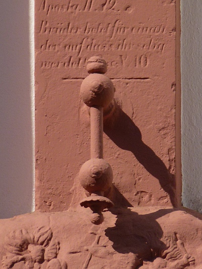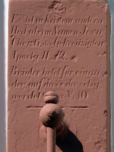 Inschrift: ES IST IN KEINEM ANDEREN HEIL ALS IM NAMEN JESU CHRISTI. APOSTELGESCHICHTE 412. BRÜDER BETET FÜREINANDER AUF DAS IHR SELIG WERDET. JAKOBUSBRIEF 516. [2]