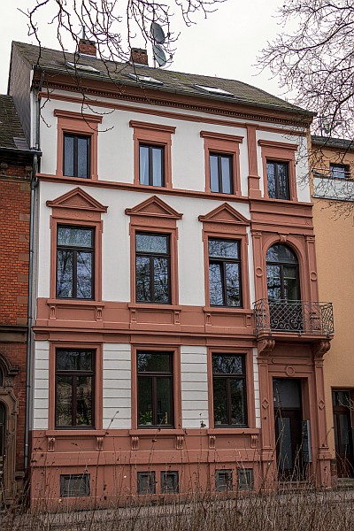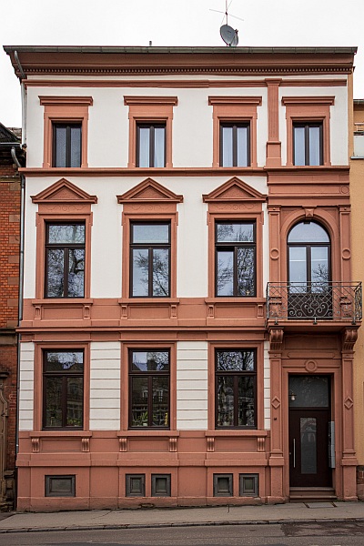 Dreigeschossiges Wohnhaus in Neurenaissanceformen, sandsteingegliederter Putzbau, Balkon in der rechts liegenden Eingangsachse. [1]
