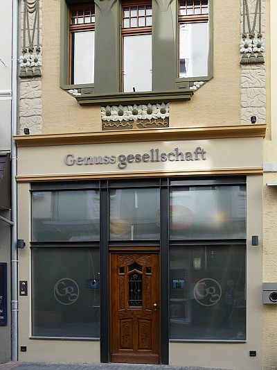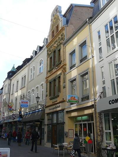 1905 als Renditeobjekt der Bauunternehmung Stephan Weber & Söhne aufgeführtes, dreigeschossiges Geschäfts- und Mietshaus Unter den von der Bauunternehmung angefertigten Plänen ist der in den Jugendstil-Schmuckdetails abgeänderte und reicher ausgeführte Fassadenentwurf von H. Meppert signiert.