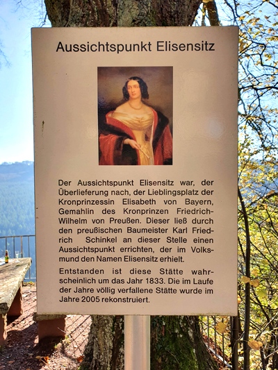Der Aussichtspunkt Elisensitz war, der Überlieferung nach, der Lieblingsplatz der Kronprinzessin Elisabeth von Bayern, Gemahlin des Kronprinzen Friedrich-Wilhelm von Preußen. Dieser ließ durch den preußischen Baumeister Karl Friedrich Schinkel an dieser Stelle einen Aussichtspunkt errichten, der im Volksmund den Namen Elisensitz erhielt. Entstanden ist diese Stätte wahrscheinlich um das Jahr 1833. Die im Laufe der Jahre völlig verfallene Stätte wurde im Jahre 2005 rekonstruiert. [2]