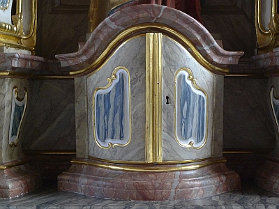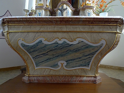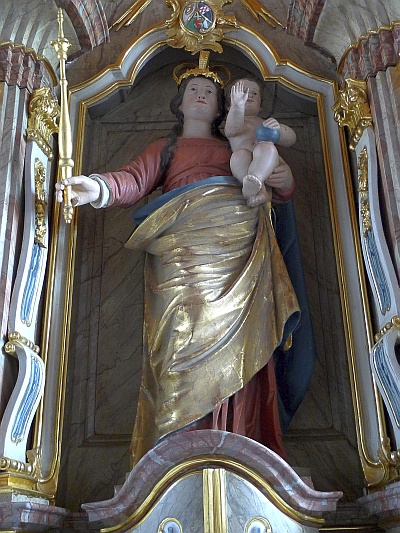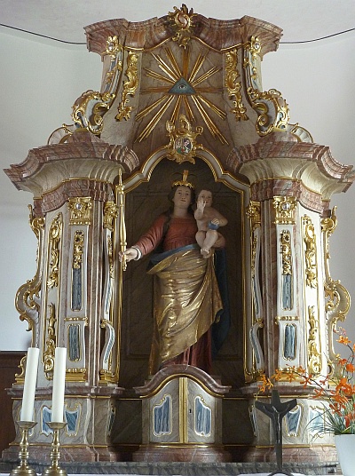 Der Hochaltar aus Holz beherbergt eine etwas ältere Holzfigur einer Mutter Gottes mit dem Kinde. Holzfiguren der Heiligen Remigius und Rochus, wohl beide von einem Altar des 17. Jahrhundert. [2]