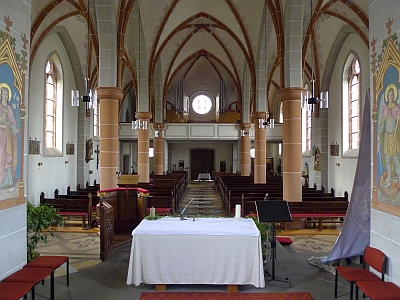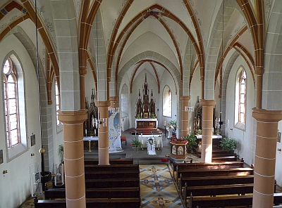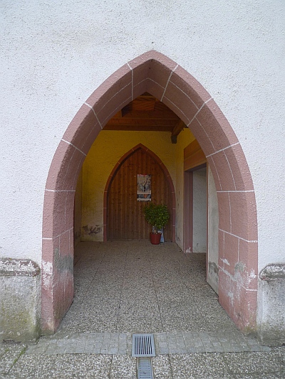 Großer, neugotischer Saalbau, 1892; Schaftkreuz, Sandstein, bezeichnet 168[.] [1]