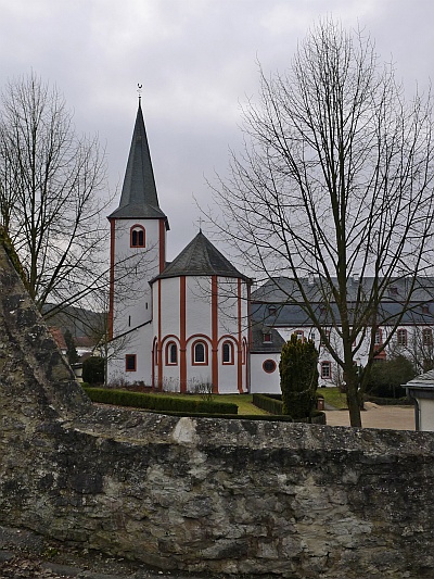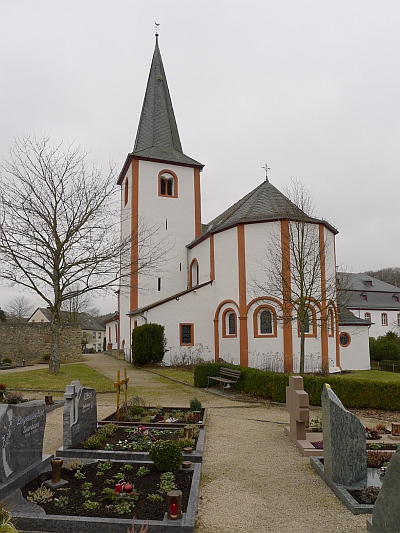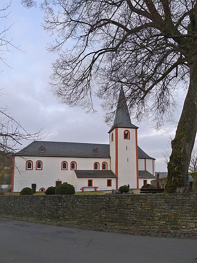 Spätromanischer Saalbau, letztes Viertel des 12. Jahrhunderts; barockes Schaftkreuz, Sandstein, bezeichnet 1759; in der Kirchhofsmauer aus Bruchstein die Reste alter Grabkreuze. [1]