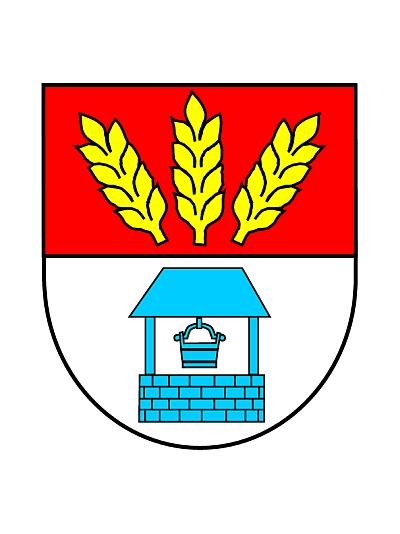 Von Rot über Silber geteilt; oben drei goldene fächerförmige Weizenähren, unten ein blauer Ziehbrunnen.