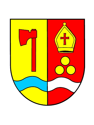 Von Gold und Rot gespalten, über einem von Blau und Silber gespaltenen Wellenbalken vorn eine rechtsgewendete rote Axt, hinten über drei goldenen Kugeln (1 : 2) eine goldene Mitra, darin ein rotes Kreuz.