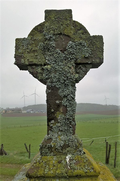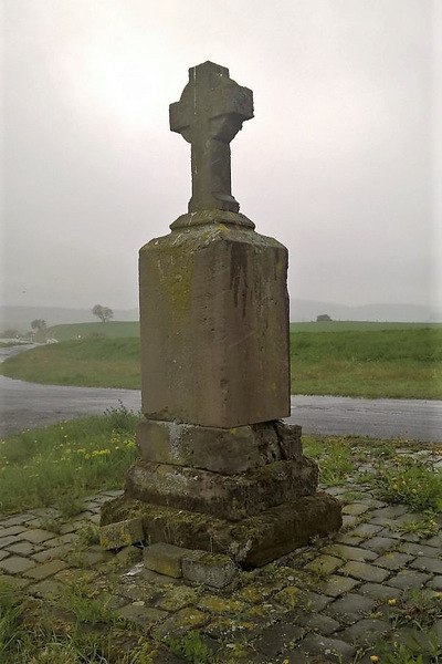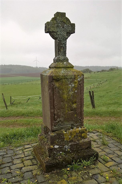 An einem Parkplatz an der L30 in Richtung Wallersheim können wir ein schweres Sandsteinkreuz auf einem dreistufigen Sockel bewundern. Auf dem Schaft ist die Inschrift: