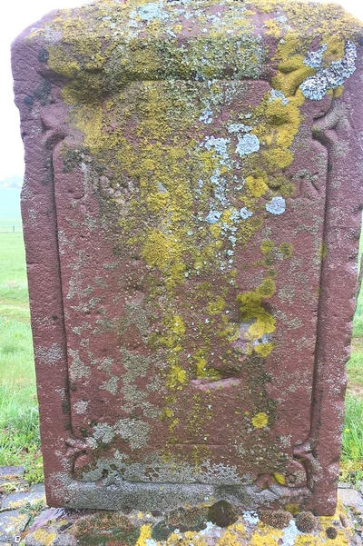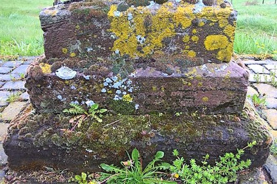 eingemeißelt. Durch einen Zierrand ist diese Inschrift hervorgehoben. Über dem Schaft ist ein kleines Kapitell, das das Abschlusskreuz trägt, angebracht. In der Mitte des Kreuzbalkens ist das IHS-Zeichen eingelassen. Ein Rosettenkranz füllt die Ecken der Kreuzbalken. [1]