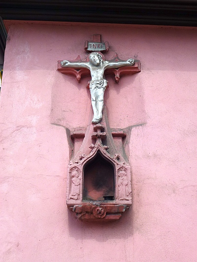 An einem der drei vom Sankt Mergener Klostergarten übrig gebliebenen Gartenpavillons in die Wand eingesetztes Oberteil eines Nischenkreuzes aus Sandstein (Schaft fehlt). Nische eingefasst von einem krabbensetzten Kielbogen, links in flachem Relief kniender Stifter, rechts stehende Stifterin, darüber nasenbesetztes Kreuz mit flachem Kruzifix und Titulus. Auf Grund des Schriftbands mit kaum mehr leserlichem Namen ("lohan") und zentralem Wappenschild mit Brezel ergeben sich zwei Deutungsmöglichkeiten für den Stifter: der kaiserliche Notar und Hofgerichtsschreiber Johannes Pistoris genannt Back, der Ende des 15. Jahrhunderts nachweisbar ist, oder der Trierer Bäckermeister und Ratsherr Johann von Weiß, der 1516-1520 das Baumeisteramt versah.