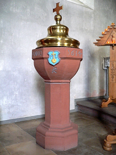DerTaufstein stammt aus dem Jahre 1614, ist aus Sandstein gefertigt und 1,14 m hoch. Er trägt die Initialen des Pastors und Stifters, Matthias Lussingen "M + L".