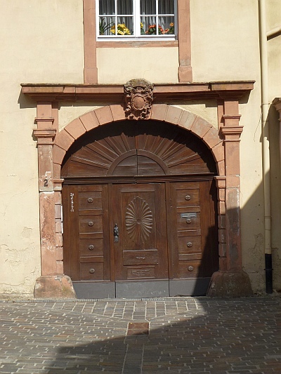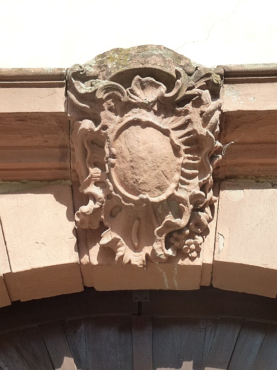 Hinsichtlich ihrer Baugattung ist die überbaute Remise im östlichen Flügel interessant. Die sich zum Hof in drei Rundbögen auf abgefasten Vierkantpfeilern laubenartig öffnende Halle ursprünglich wohl auch um die Ostseite des Innenhofs verlängert. - Die barocke Überformung der Wirtschaftsgebäude beschränkte sich im wesentlichen auf die Neugestaltung des Tor-Mittelbaus: dort korbbogige, pilastergerahmte Torfahrt mit Rocaille-Kartusche, um 1750-60. Das Torblatt frühes 19. Jahrhundert. [1]