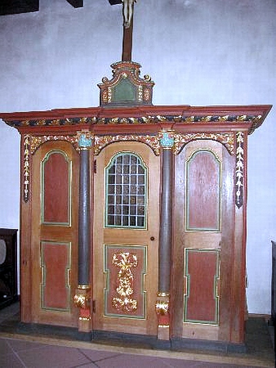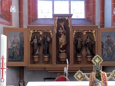 1341 erstmals erwähnt. Der jetzige Bau wurde 1492 begonnen und gegen 1570 vollendet. Wappen in den alten Schlusssteinen und altem Sakramentschrein. [3]