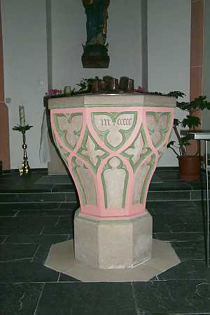 In der neuen Kirche, erbaut nach den Plänen von Bauinspektor Dallmer, ist von der alten Kirche nur der Taufstein aus dem Jahre 1500 erhalten, der aus heimischem Sandstein gefertigt wurde. [1]