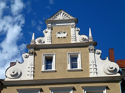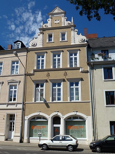 Das ältere Traufenhaus Nr. 56 folgt dem Standardtyp des städtischen Wohn- und Mietshauses der siebziger und achtziger Jahre mit einer klassizisierende, vorrangig mit dem Formenvokabular der italienischen Renaissance arbeitenden Stilhaltung (das ursprüngliche Portal in der linken Fassadenachse zu einem Fenster umgebaut, das rechte Parterrefenster schon 1904 zur Tür umgebaut). Nr. 57 hingegen liegt das bodenständige und spätmittelalterliche bürgerliche Giebelhaus zugrunde. Im Erdgeschoss bogige Schaufenster mit Wappenschlußsteinen. Der als Blickfang dienende, die gesamte Hausbreite einnehmende Zwerchgiebel im Stil der deutschen Spätrenaissance mit reichem Volutenwerk, Obeliskenaufsätzen und Beschlagwerk- und Muscheldekor ausgestattet. [1]