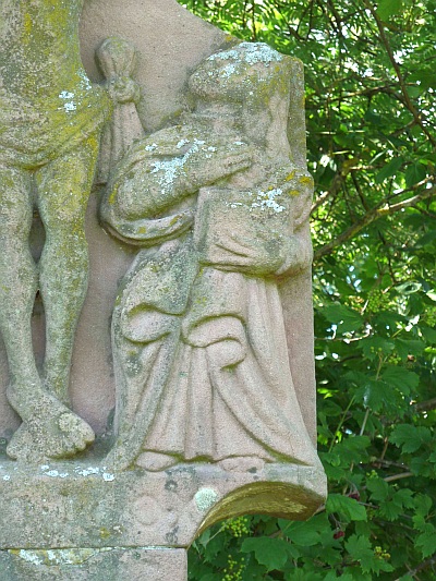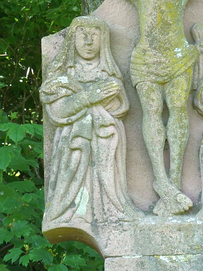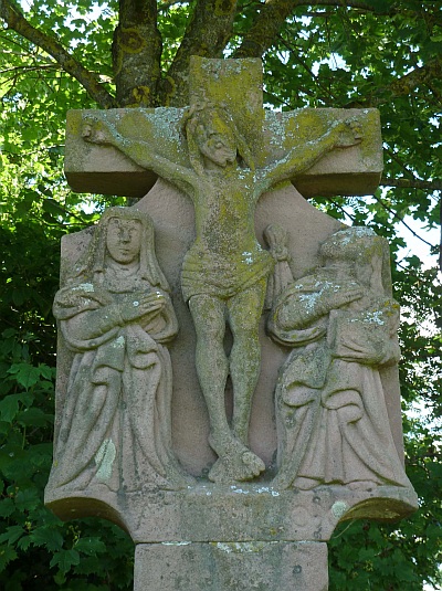 Nördlich des Ortes, in einer Feldweggabelung. Hoher, gut erhaltener Kreuzigungsbildstock, laut Inschrift 1610 durch PAULUS MEIDIS errichtet (die Jahreszahl als 160X geschrieben). Zeittypisch die kleinen Voluten, die am glatten Schaft den Übergang von den Fasen zum quadratischen Querschnitt überspielen. Breiter Aufsatz vom sogenannten Schönecker Typ mit den Beifiguren der Maria und des Johannes, die sehr plastischen Reliefs in einfacher Steinnietzarbeit.