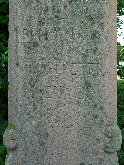 Laut nachgetragener Inschrift über der ursprünglichen am Schaftfuß 1890 durch IOH. PETER MEUTES renoviert (Meidis bzw. Meutes heißt das Stockgut Hauptstraße 32 [...]). [1]