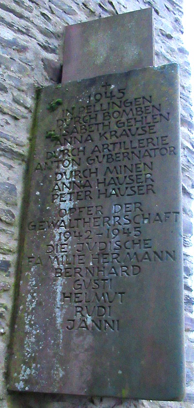 Am Obelisk wurden nachträglich an den Seiten Tafeln angebracht mit den Namen der Gefallenen beider Weltkriege, Bombentote und Opfer der Gewaltherrschaft in Pellingen. [2]