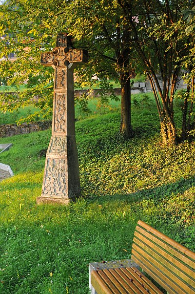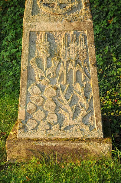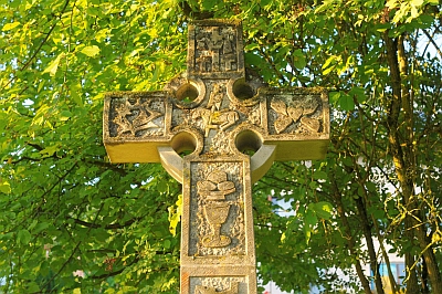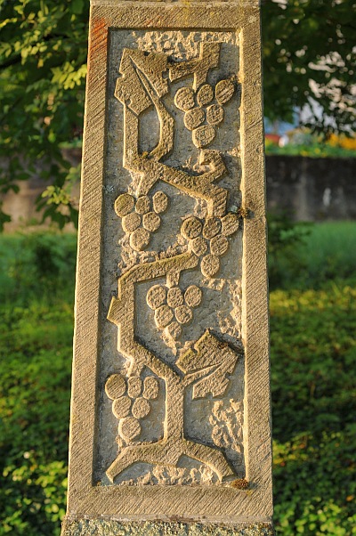 Im Einzeln besteht das Kreuz aus vier mit gehauenen Flachreliefs dekorierten Blöcken. Der obere, der eigentliche Kreuzblock (2. Bild) zeigt die Symbole der Passion, der Auferstehung und der Eucharistie gruppiert um das Lamm Gottes mit der Siegesfahne. Dies ist eine kompakte Zusammenfassung der christlichen Theologie, die somit über die darunter in drei weiteren Blöcken dargestellte Dorfgeschichte gestellt ist. Die ist symbolisiert mit dem Weinstock (3. Bild), den Ähren (5. Bild), den