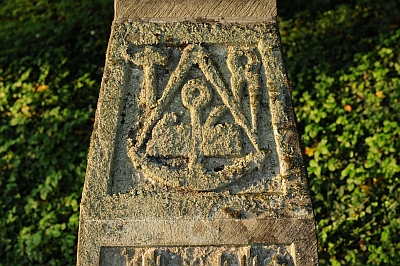 Abzeichen der früheren Handwerksberufe (4. Bild), wobei der Anker besonders auf die vielen von Alters her in Oberbillig ansässigen Schifferfamilien hinweist. Die Steine links im Sockelblock (5. Bild) verweisen auf den früher regen Abbau von Kalkstein, der von etlichen Familien über viele Generationen in eigenen Brüchen betrieben wurde.