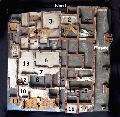 [3] Modell des römischen Stadthauses unter der Villa Schaab, erstellt 1897 im Maßstab 1:50, Rheinisches Landesmuseum Trier. Raumbenennung, Nummerierung und Beschreibung nach Hubert Krebs, Bonner Jahrbücher 103.