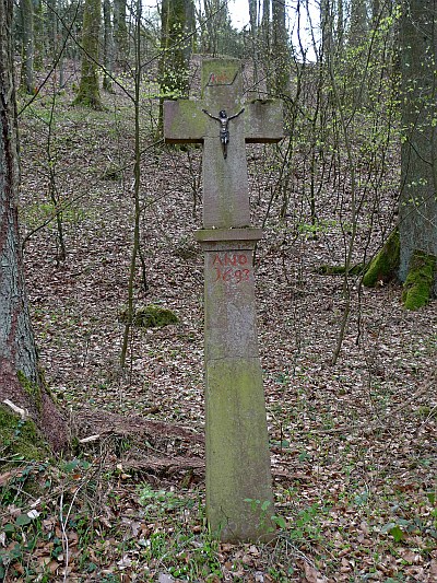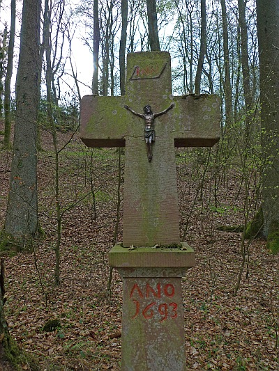 Südlich der Ortslage im Wald nahe der Gemarkungsgrenze: Wegekreuz; Schaftkreuz, bezeichnet 1693. [1]