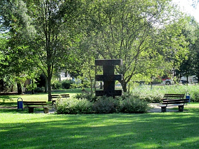 Neuromanischer Saalbau mit Fassadenflankentürmen, 1908/09, Architekt Ernst Brand, Bautengruppe aus Kirche, Wandelgang und Pfarrhaus mit Park- und Grünanlage (mit kreuzförmiger Wegeführung), Neuanlage zwischen den beiden Dorfkernen. [1]